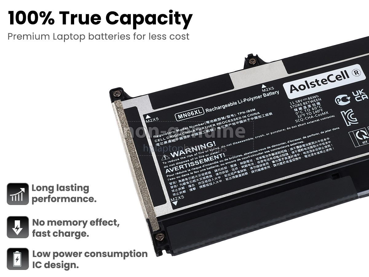 Choose one high-quality replacement HP MN06XL battery to enhance the performance of your laptop! Our brand new replacement HP MN06XL battery is made with high-quality cells from SANYO. All our replacement HP laptop batteries have passed international certification( CE, UL, ROHS, ISO9001/9002, etc.) and passed through strict safety testing, we guarantee all batteries for HP MN06XL are high performance, long-life, and safety, 100% OEM compatible with the original specification( size, etc.), no memory effect. Furthermore, our replacement HP MN06XL batteries are produced from eco-friendly materials without lead or mercury.